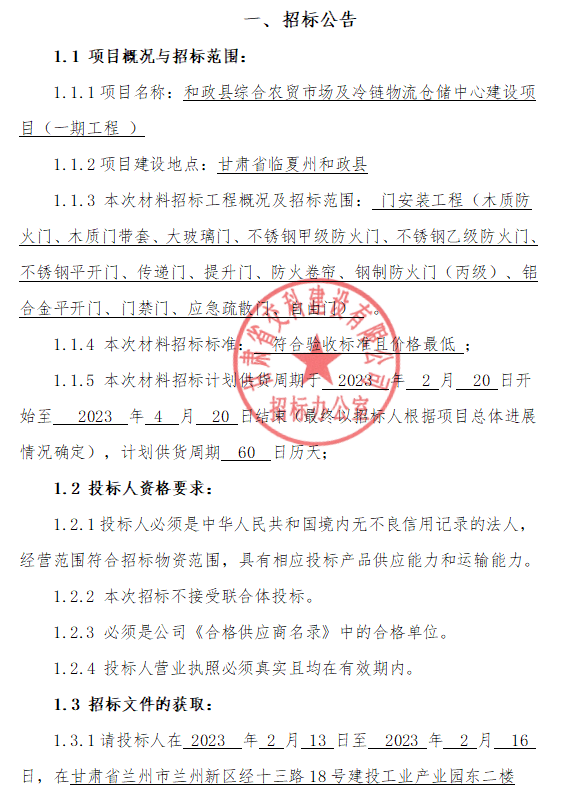 和政縣綜合農(nóng)貿(mào)市場及冷鏈物流倉儲中心建設項目(一期工程 )材料招標