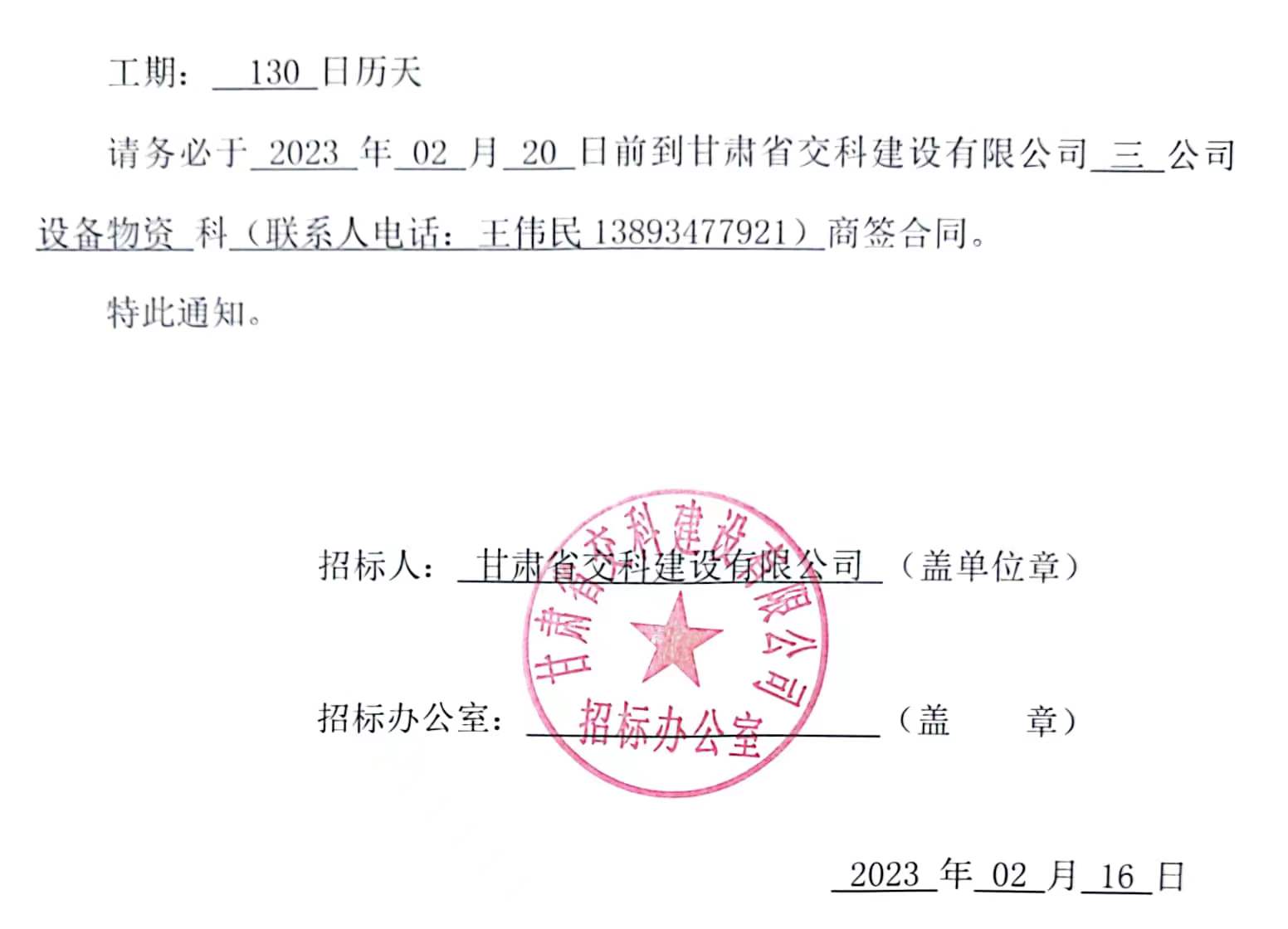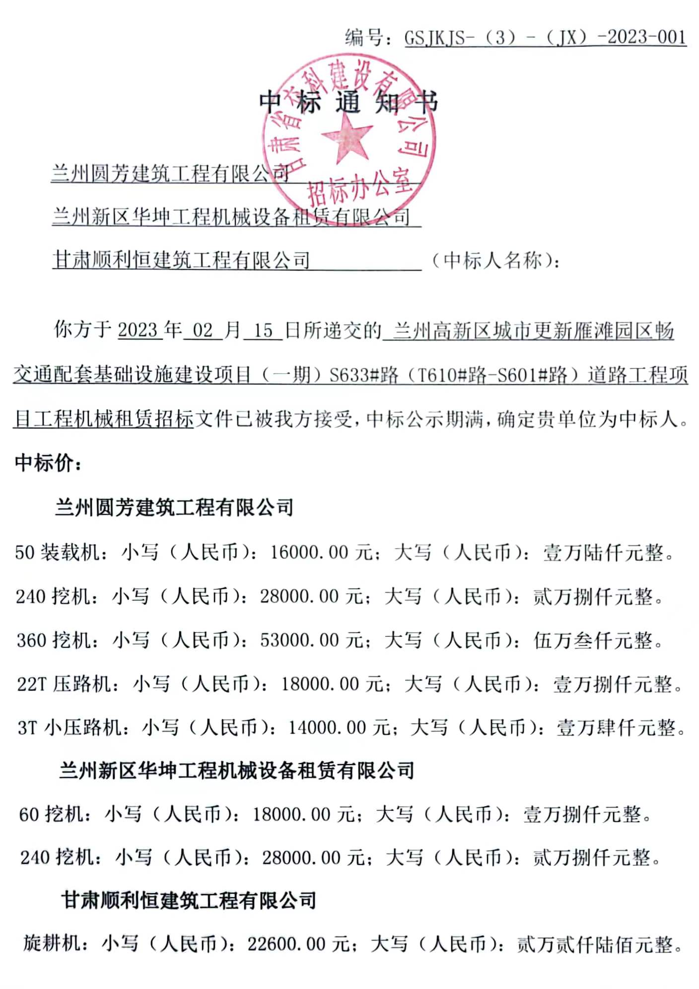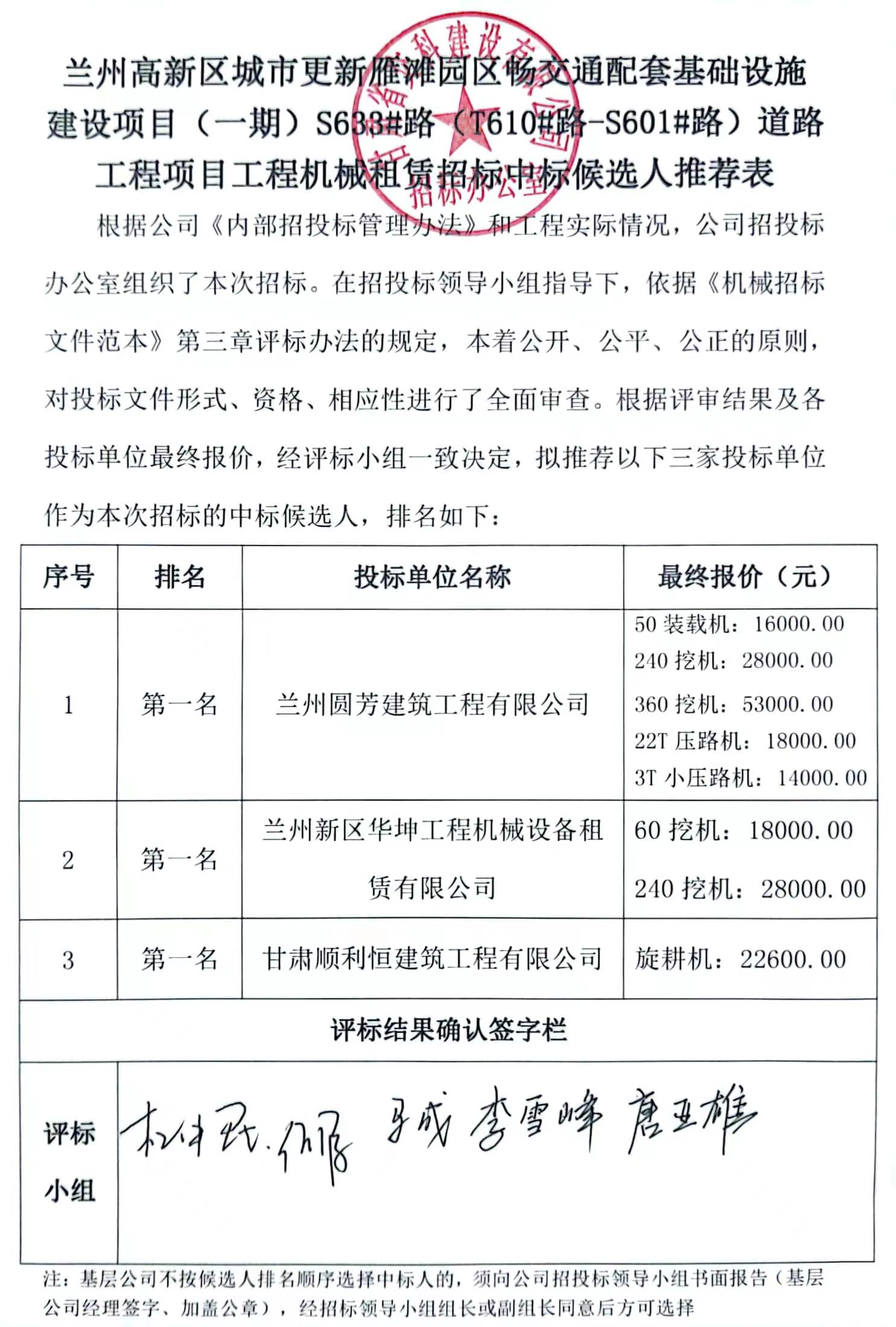 蘭州高新區(qū)城市更新雁灘園區(qū)暢交通配套基礎(chǔ)設(shè)施建設(shè)項目(一期)S633#路(T610#路-S601#路)道路工程項目工程機械租賃中標候選人及中標通知書