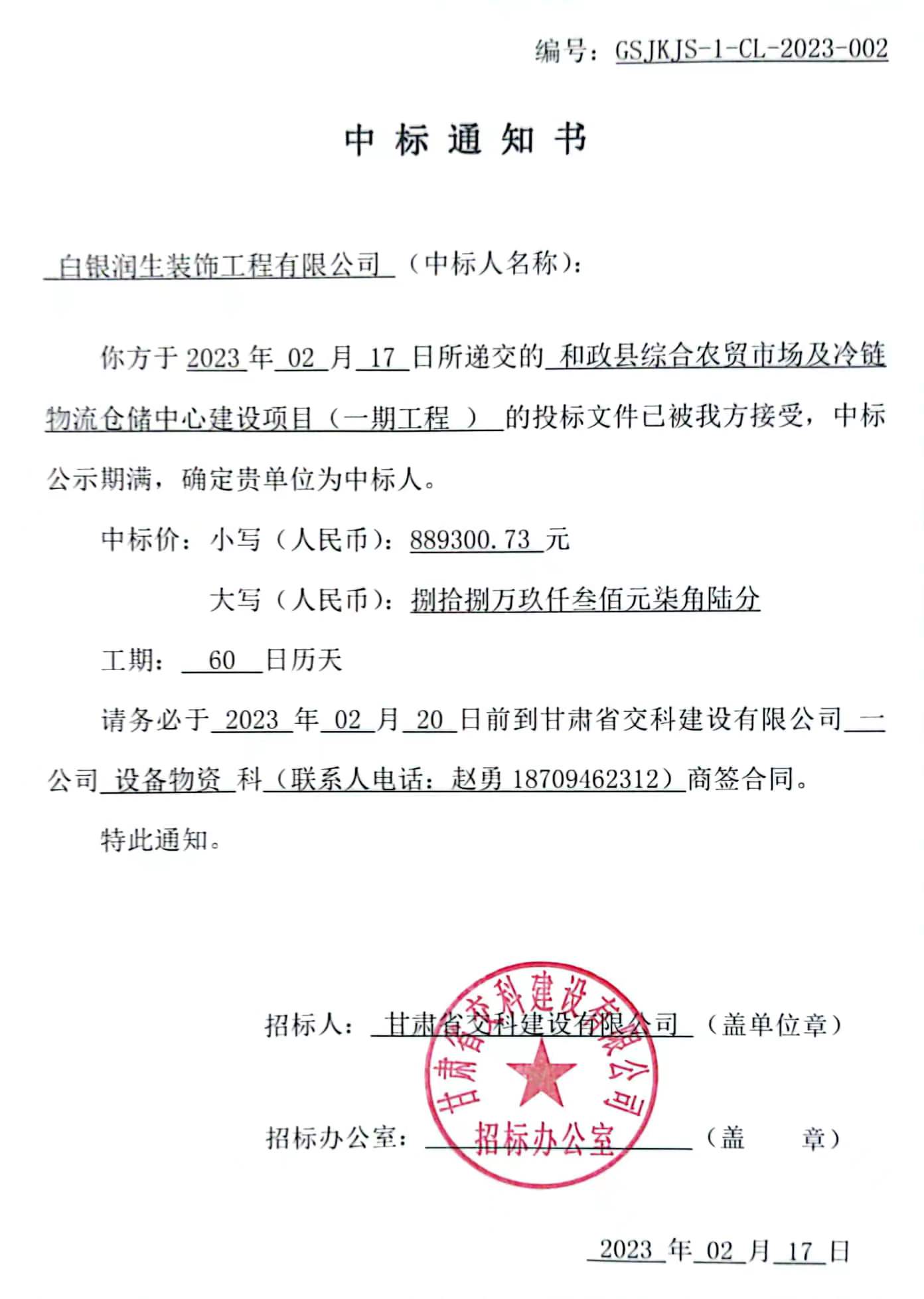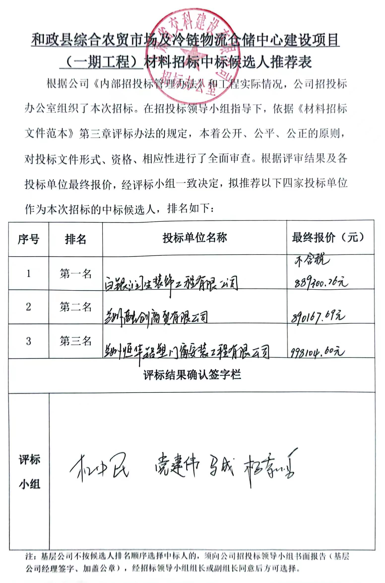 和政縣綜合農(nóng)貿(mào)市場(chǎng)及冷鏈物流倉儲(chǔ)中心建設(shè)項(xiàng)目(一期工程 )材料招標(biāo)中標(biāo)候選人及中標(biāo)通知書