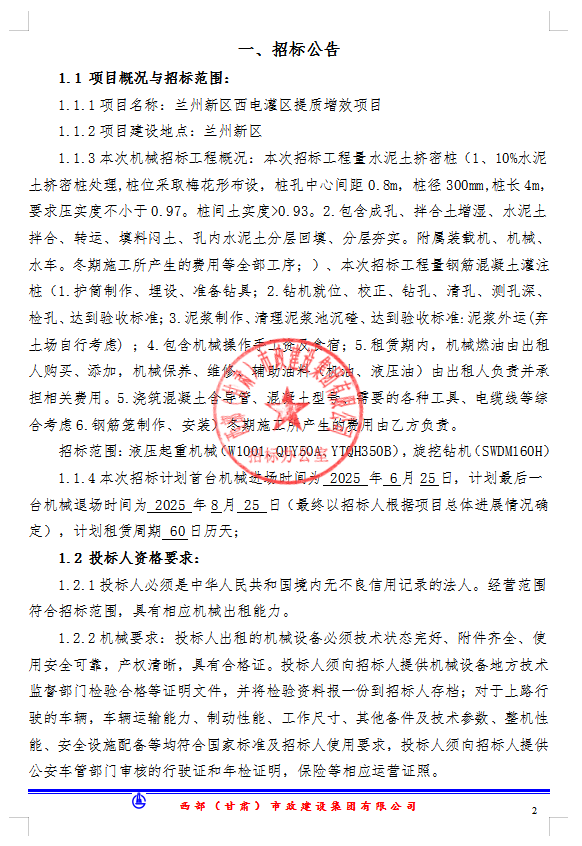 蘭州新區(qū)西電灌區(qū)提質(zhì)增效項目-機械租賃招標(biāo)公告