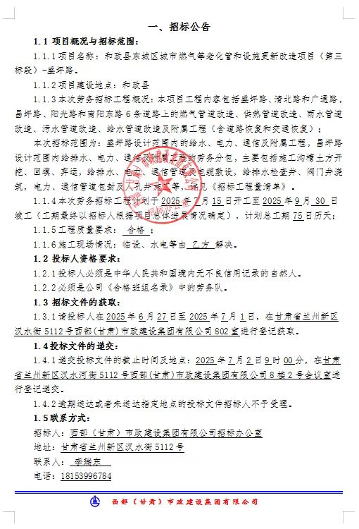 和政縣東城區(qū)城市燃?xì)獾壤匣芎驮O(shè)施更新改造項(xiàng)目(第三標(biāo)段)-盛坪路-勞務(wù)分包-招標(biāo)公告