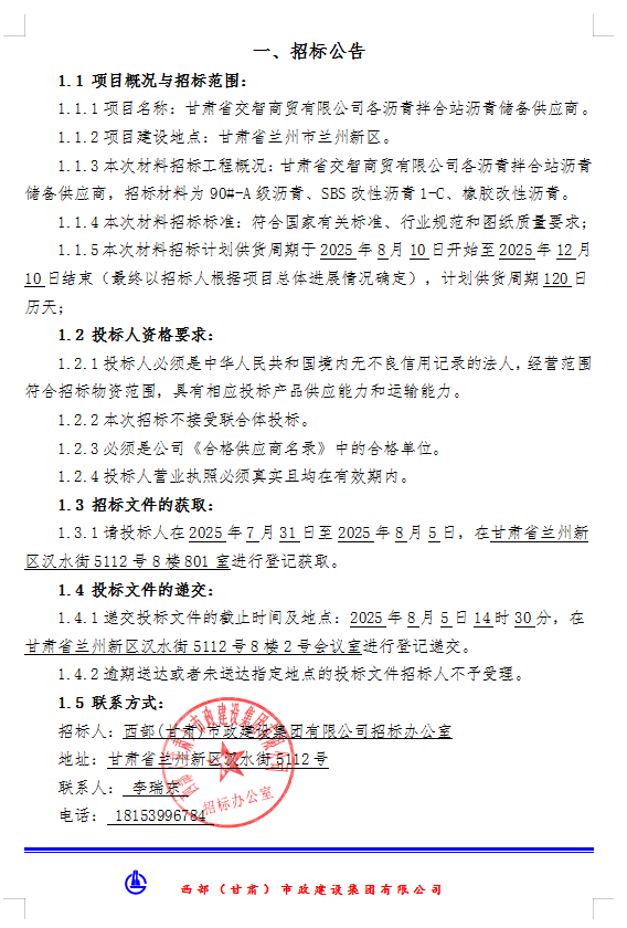 甘肅省交智商貿(mào)有限公司各瀝青拌合站瀝青儲備供應(yīng)商-材料招標公告
