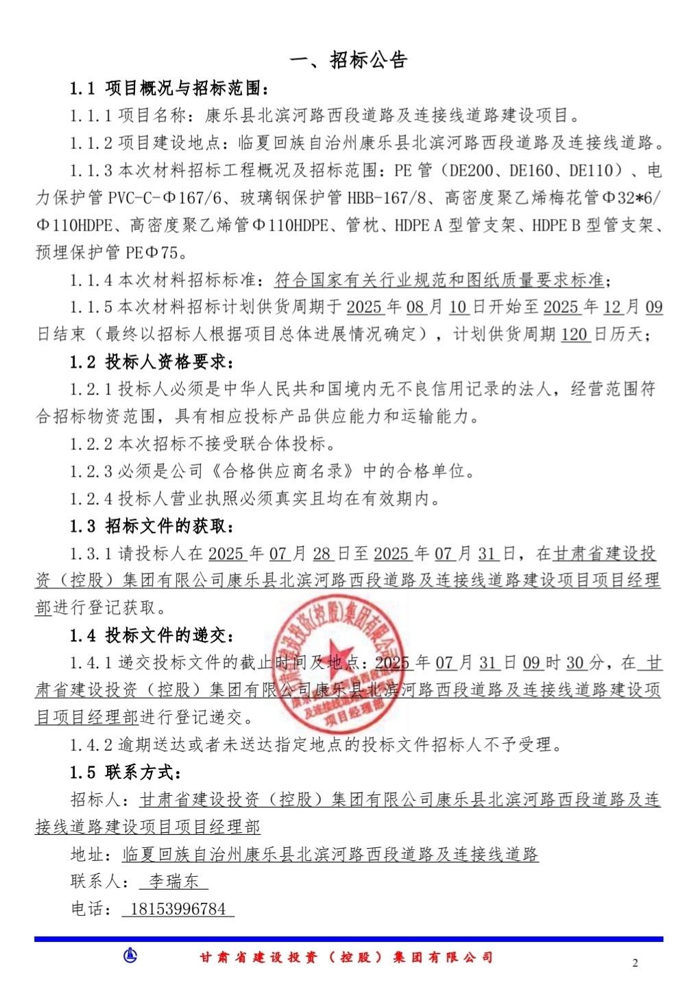 康樂縣北濱河路西段道路及連接線道路建設(shè)項(xiàng)目-材料招標(biāo)-招標(biāo)公告