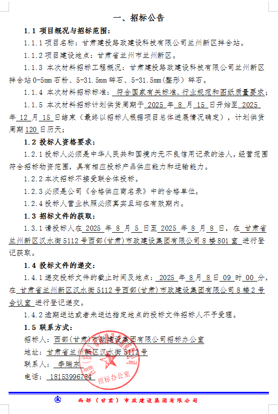 甘肅建投路政建設(shè)科技有限公司蘭州新區(qū)拌合站-材料招標(biāo)公告